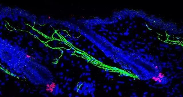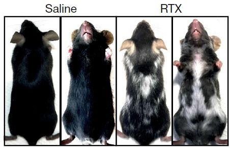 在三組中,用辣椒素類似物——樹脂毒素(通過痛覺誘導(dǎo)壓力產(chǎn)生)誘導(dǎo)的壓力組小鼠是出現(xiàn)白色毛發(fā)迅速明顯的,在注射后的下一個(gè)毛發(fā)生長(zhǎng)周期中就長(zhǎng)出了不少白色毛發(fā),另外兩組則用了3-5個(gè)周期才達(dá)到這種效果。這也說明,無(wú)論是什么形式的壓力,都會(huì)導(dǎo)致白色毛發(fā)的產(chǎn)生。