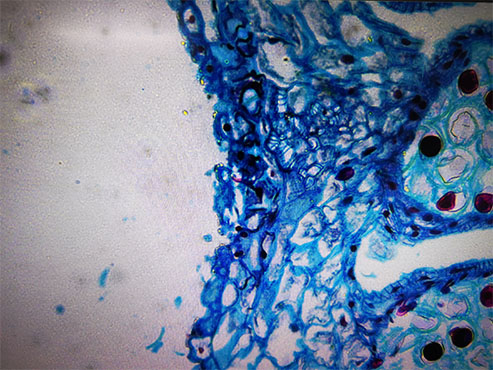 挑好一根粗細(xì)、濕度合適的樹枝,用專門的工具對(duì)其進(jìn)行切片。切片一定要非常薄,太厚會(huì)阻礙光透過切片,在顯微鏡下成像不清晰,影響觀感。