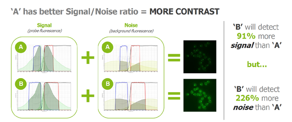 使用帶通濾光片可以獲得相對(duì)更高信噪比的熒光成像,而不同參數(shù)的帶通濾光片,會(huì)對(duì)成像效果有重大影響,比如下圖A和B兩組帶通濾光片,A組濾光片是窄帶,搭配比B組能多檢測(cè)出90%的有用信號(hào),減少200%的背景干擾信號(hào),在圖像上表現(xiàn)為A組信號(hào)更清晰透亮。此外,由于技術(shù)水平問(wèn)題,國(guó)內(nèi)窄帶濾光片的截止深度(OD)要比進(jìn)口差,光譜表現(xiàn)為光通效率到邊緣“緩坡下降”而不是“斷崖下降”,最終成像效果不如進(jìn)口窄帶,單要稍優(yōu)于普通帶通。