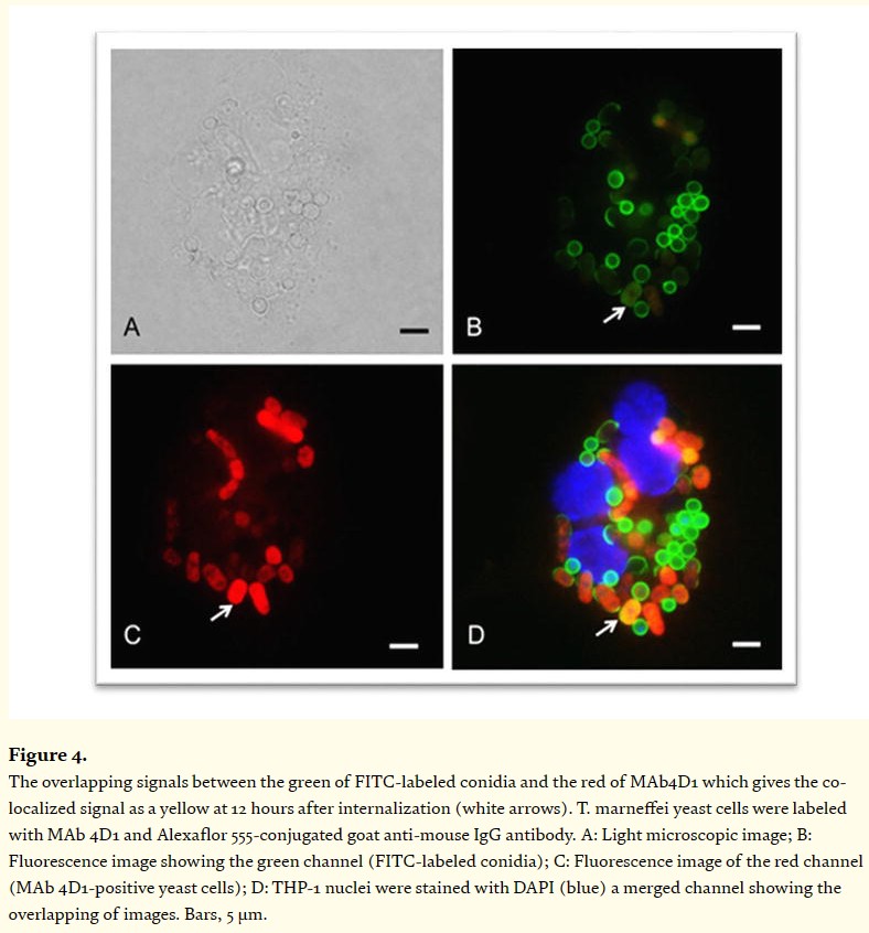 這個(gè)感染過程可以通過熒光染色結(jié)合熒光顯微鏡觀察研究。使用FITC標(biāo)記孢子,用Alexa Fluor Plus 555標(biāo)記酵母態(tài),DAPI標(biāo)記細(xì)胞核,可以看到部分紅色信號(hào)和綠色信號(hào)重疊形成黃色信號(hào),顯示巨噬細(xì)胞中的馬爾尼菲籃狀菌正從菌絲態(tài)的孢子轉(zhuǎn)變?yōu)榻湍笐B(tài)。