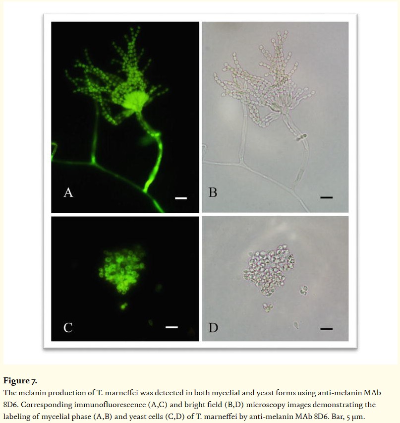 進(jìn)一步研究馬爾尼菲籃狀菌的致病性,用FITC標(biāo)記真菌黑色素,證明無論是菌絲態(tài)還是酵母態(tài),都出現(xiàn)明顯的熒光反應(yīng),顯示馬爾尼菲籃狀菌雙態(tài)下都有真菌黑色素作為毒力因子,干擾宿主免疫系統(tǒng)正常響應(yīng),這可能是其能在體內(nèi)深層引起多器官感染的其中一個(gè)原因。