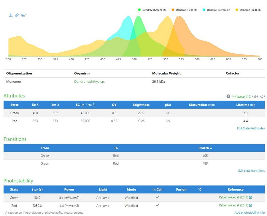 這種綠紅轉(zhuǎn)化的熒光蛋白來自珊瑚,因其轉(zhuǎn)化跟秋天的楓葉從綠變紅相似,故而得名Kaede(楓葉),但由于性質(zhì)限制,Kaede并不是可靠易用的商用活細(xì)胞染色劑。在超分辨成像中常用的光轉(zhuǎn)化熒光蛋白主要有Dendra2、mEos2、和mKikGR三種。