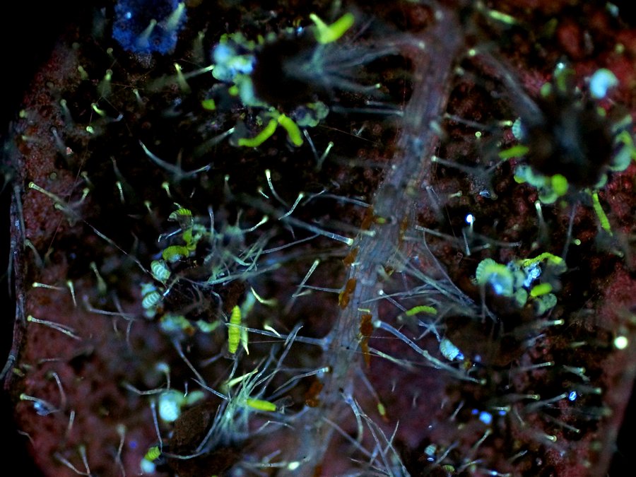 長通U激發(fā)下的蕨葉,可見多色熒光