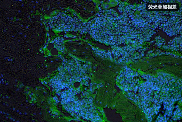無限遠光學顯微鏡可以做到相襯成像視野和熒光成像視野完全一致,因此可以拍攝合成出有輪廓感/立體感的細胞熒光圖像。一般這需要先用平場消色差相襯物鏡拍攝相襯,然后切換到半復消色差物鏡拍攝熒光,以免損失熒光亮度,為了方便用戶進行這種拍攝,明美還推出了半復消色差相襯物鏡,可以一個物鏡把相襯和熒光都拍好。