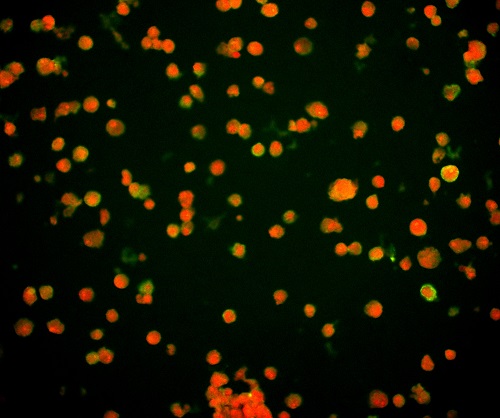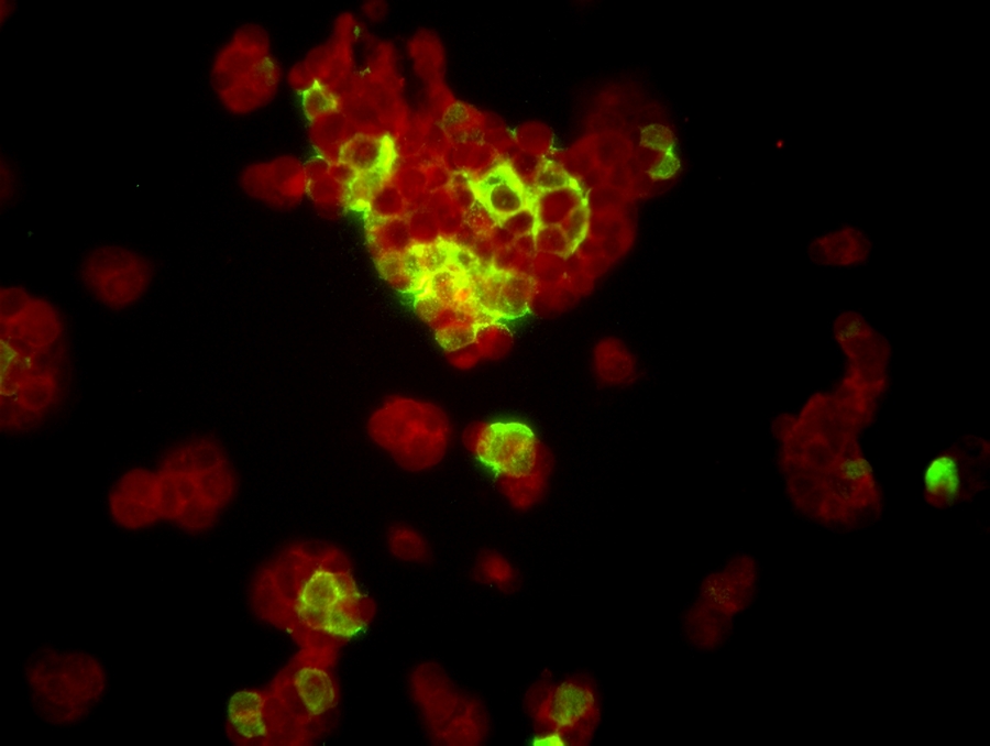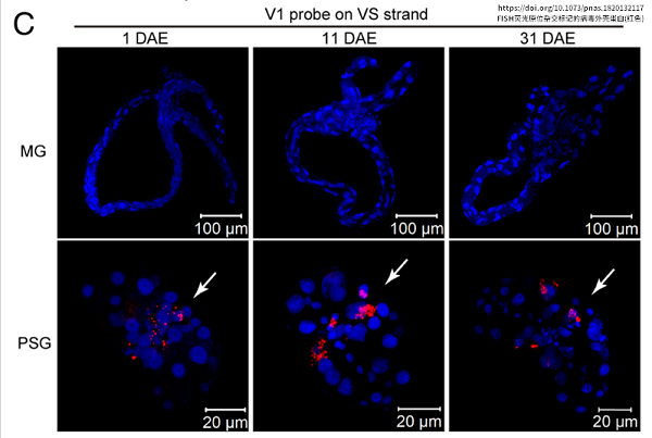 FISH做的病毒檢測(cè),紅色為病毒外殼蛋白