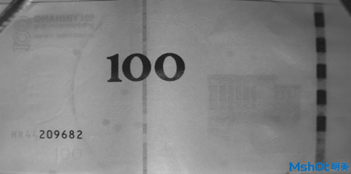 本文所述就是借鑒此法鑒定100元人民幣真?zhèn)蔚慕t外光譜檢測方法。具體如下:在實驗室日光燈照明的普通條件下,100元人民幣通過近紅外光源(940nm LED)照射,使用明美自主研發(fā)的近紅外相機(科研級SCMOS圖像傳感芯片,作為光學傳感器接收紙幣反饋紅外光譜的信息,內(nèi)置近紅外濾光片、500萬有效像素、1.2英寸大靶面芯片、380-1300nm光譜響應范圍)搭配宏觀鏡頭拍攝紙幣正反面,對成像進行鑒定。