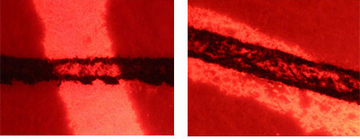 如下圖;左圖為明場(chǎng)透射光的圖片,右圖為熒光圖,對(duì)比左右兩圖可以發(fā)現(xiàn),在交叉部位的所有非孔漏處都無(wú)熒光,即為先朱后墨。
