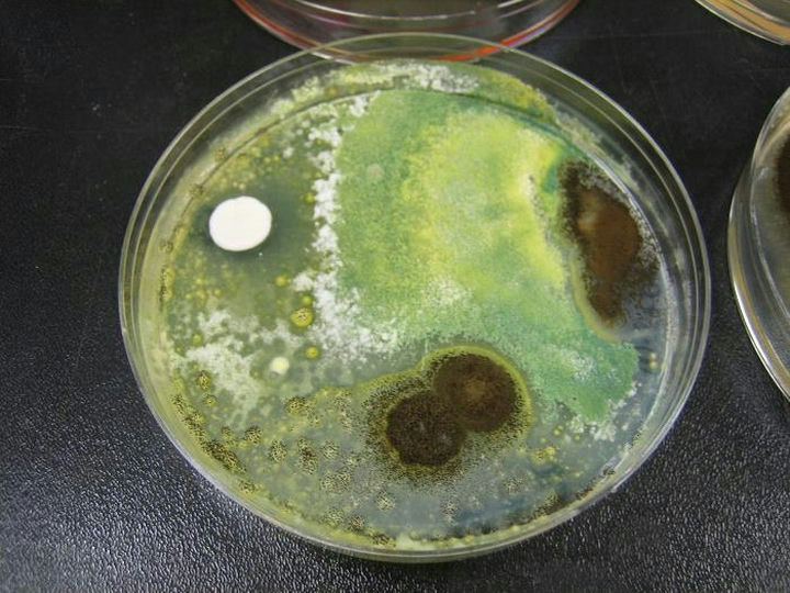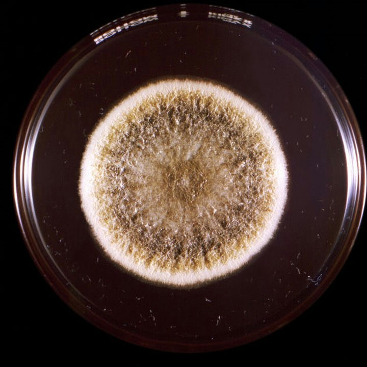 培養(yǎng)皿中看到,菌落生長較快,結(jié)構(gòu)疏松,表面灰綠色,背面無色或略呈褐色。