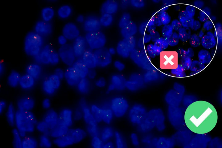 熒光原位雜交(Fluorescence In Situ Hybridization,F(xiàn)ISH)是臨床病理檢測中廣泛運用的一種分子細(xì)胞遺傳學(xué)診斷技術(shù),其原理是用熒光染料直接或間接標(biāo)記的DNA核酸探針與待測樣本中的DNA核酸序列按照堿基互補配對的原則進(jìn)行雜交,然后通過熒光顯微鏡觀察熒光信號位置、數(shù)量等來判斷待測序列的缺失、擴增及易位等情況。