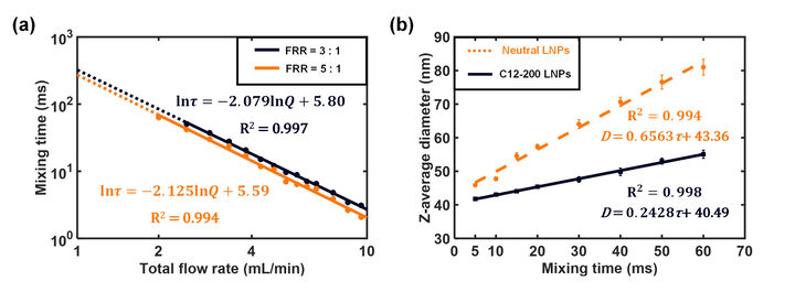 圖1 使用慣性混合器表征混合特性和微調(diào)脂質(zhì)納米粒子的大小。(a) 不同流速比下混合時(shí)間與總流速的函數(shù)關(guān)系。實(shí)線表示完全混合,虛線表示不完全混合。在本實(shí)驗(yàn)中,混合器的通道尺寸為 250 μm,混合時(shí)間是通過(guò)明美倒置顯微鏡拍攝后進(jìn)行計(jì)算。(b) 不同混合時(shí)間下 C12-200 LNPs 和中性 LNPs 的平均粒徑,使用 250 μm 的混合器,F(xiàn)RR 為 5:1結(jié)果為三個(gè)獨(dú)立批次的平均值 ± SD。