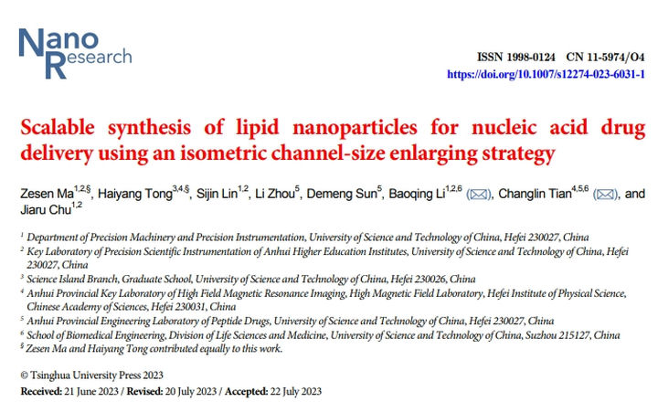 為此,中科大工程學(xué)院褚家如教授團(tuán)隊(duì)的李保慶副教授與生命科學(xué)與醫(yī)學(xué)部田長(zhǎng)麟教授團(tuán)隊(duì)經(jīng)過(guò)深入研究,提出了一種“等比例縮放通道尺寸”的可擴(kuò)展化脂質(zhì)納米粒子合成策略。該策略通過(guò)在三個(gè)維度上等比例縮放慣性微流體混合器,實(shí)現(xiàn)了LNPs的可擴(kuò)展合成。同時(shí),我們基于流體力學(xué)的相似性理論并利用無(wú)量綱分析開發(fā)了一種理論預(yù)測(cè)方法,通過(guò)控制混合時(shí)間在不同芯片上保持一致,確保合成的LNPs具有一致的粒徑和尺寸分布。這一創(chuàng)新性方法為L(zhǎng)NPs的大規(guī)模生產(chǎn)提供了實(shí)際可行的途徑,加速了核酸藥物研發(fā)向臨床應(yīng)用的轉(zhuǎn)化。相關(guān)成果發(fā)表在Nano Research上。中國(guó)科學(xué)技術(shù)大學(xué)博士生馬澤森和童海洋為該論文共同主作者。
