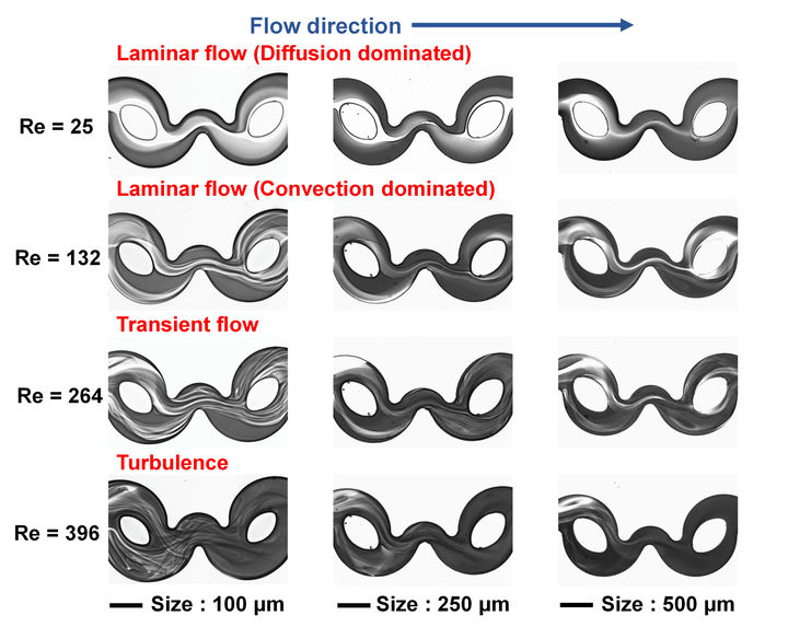 圖3通道尺寸為100、250和500μm的混合器的前兩個(gè)混合元件的流態(tài)俯視圖。流動(dòng)狀態(tài)包括層流(Re=25和132)、瞬態(tài)流(Re=264)和湍流(Re=396)。圖像經(jīng)過(guò)數(shù)字處理以增強(qiáng)對(duì)比度。將溶解有黑色染料(0.025g/mL)作為示蹤劑的去離子水和乙醇以3:1的FRR泵入混合器中。流動(dòng)方向是從左到右。