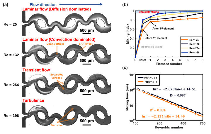 圖2 慣性流混合器中流動(dòng)狀態(tài)和混合特性的演變。(a) 前三個(gè)混合元件中流體在層流(Re= 25和 132)和湍流(Re= 396)時(shí)的流動(dòng)俯視圖,使用明美倒置顯微鏡拍攝。(b) 不同流動(dòng)距離下混合物流的混合指數(shù)。不同流動(dòng)距離下的混合指數(shù),F(xiàn)RR 為 5:1?;旌现笖?shù)用于評(píng)估混合過(guò)程,0.95 的值被設(shè)定為可接受的完全混合下限。(c) 不同流速比下混合時(shí)間與雷諾數(shù)的函數(shù)關(guān)系。實(shí)線表示完全混合,虛線表示不完全混合。所用混合器的通道尺寸為 250 微米。