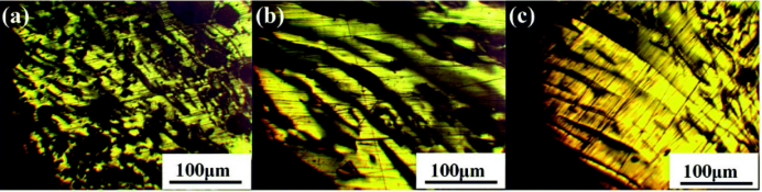 偏光觀察下的中間相瀝青(a) N1-MP, (b) N2-MP and (c) N3-MP