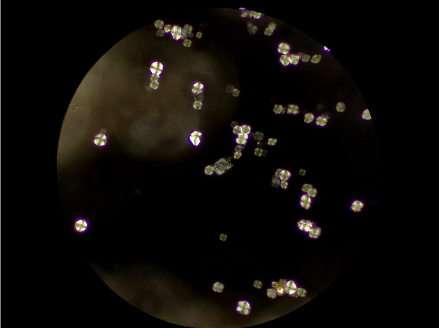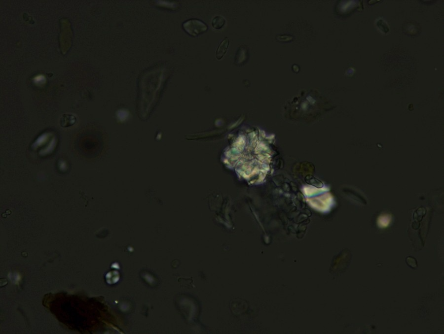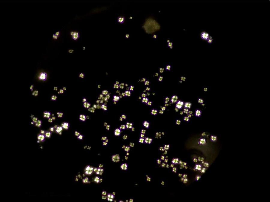 在其他視野中,我們也看到了一些其他偏光反應(yīng),可能是草酸鈣簇晶之類(lèi)成分,也可能是玻片或者水中的雜質(zhì)。