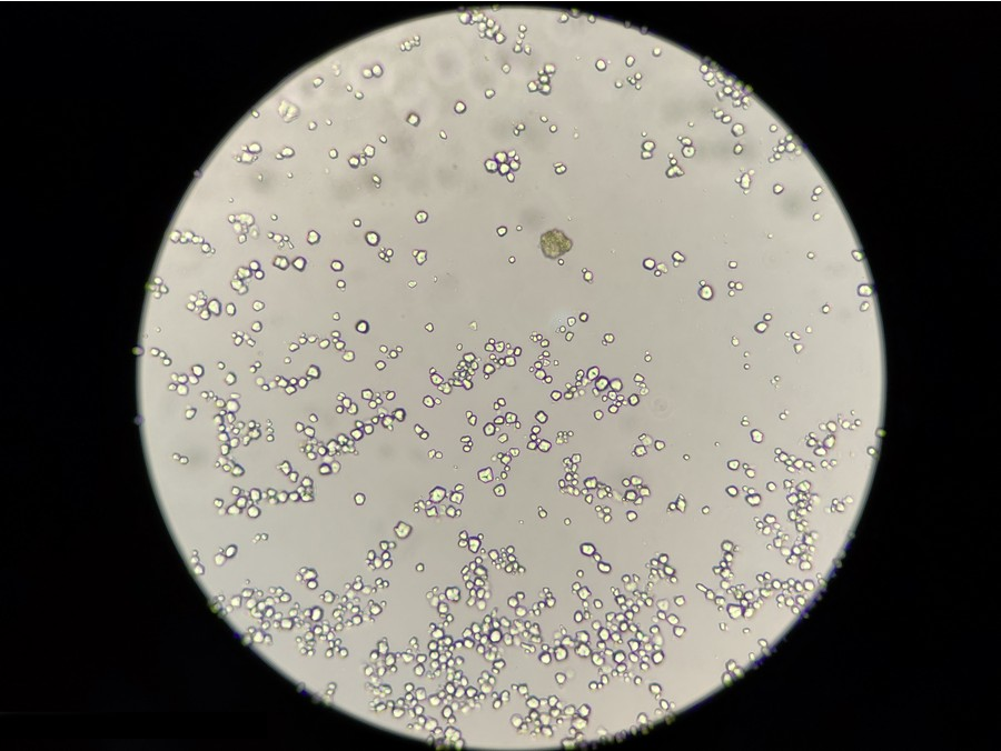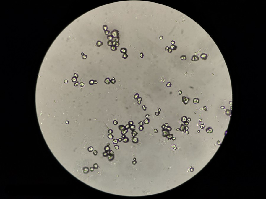 使用生物顯微鏡ML31進(jìn)行明場(chǎng)鏡檢,可見(jiàn)很多顆粒,少量雜質(zhì),可能是殘留的草藥植物纖維,也可能是玻片或者水本身帶的雜質(zhì)。