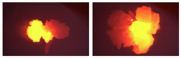 定性觀察:通過MZX100獲取的高對比度熒光圖像清晰顯示,在過表達(dá)ZmHSCF1后,代表著成功轉(zhuǎn)化的RFP陽性愈傷組織(呈現(xiàn)紅色熒光) 在數(shù)量和旺盛程度上都遠(yuǎn)超對照組。