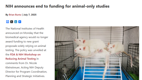 2025年美國國立衛(wèi)生研究院(NIH)正式宣布一項顛覆性政策:從本財年開始,不再資助僅依賴動物模型的臨床前研究。