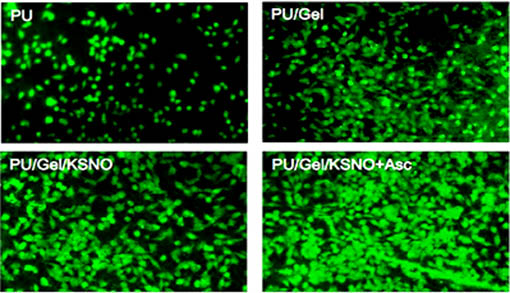 2.FITC 熒光標(biāo)記細(xì)胞,考察在材料表面的粘附生長(zhǎng)狀況(Chemical Engineering Journal 400 (2020) 125964)(IF>10)